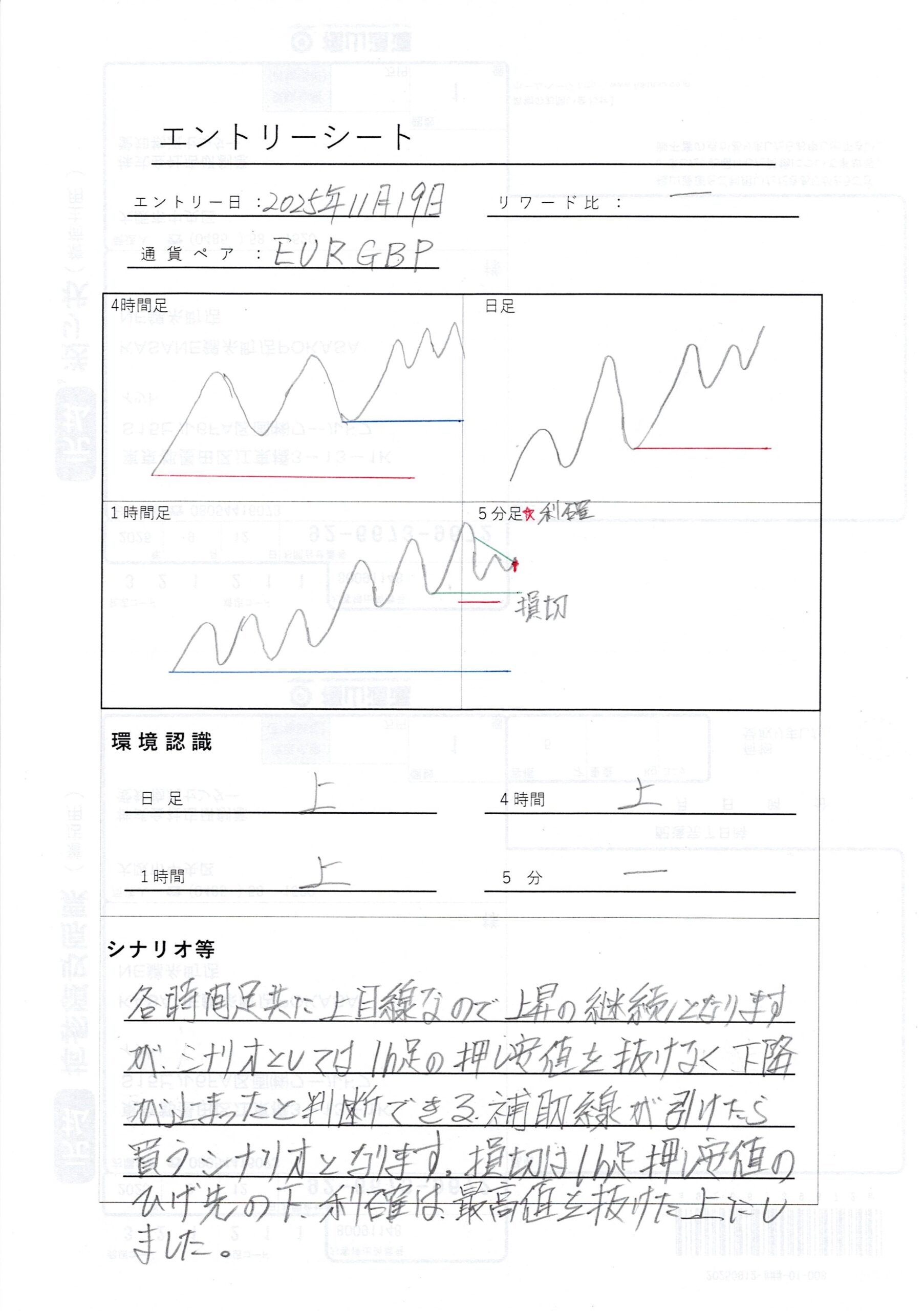 2025年11月19日にEURGBPで買いになりますが、 エントリーをしましたのでエントリーシートを 作成しました。