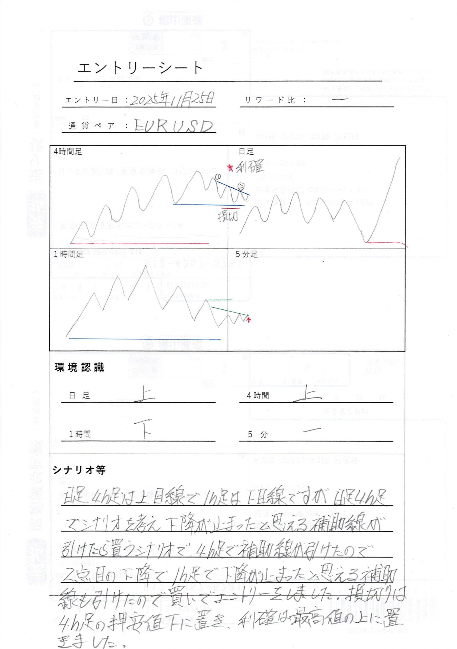 11月25日(火)EURUSDになりますが買いでエントリーを したのでエントリーシートを作成しました。 (間違えて過去検証の方にアップをしたので再送します。)