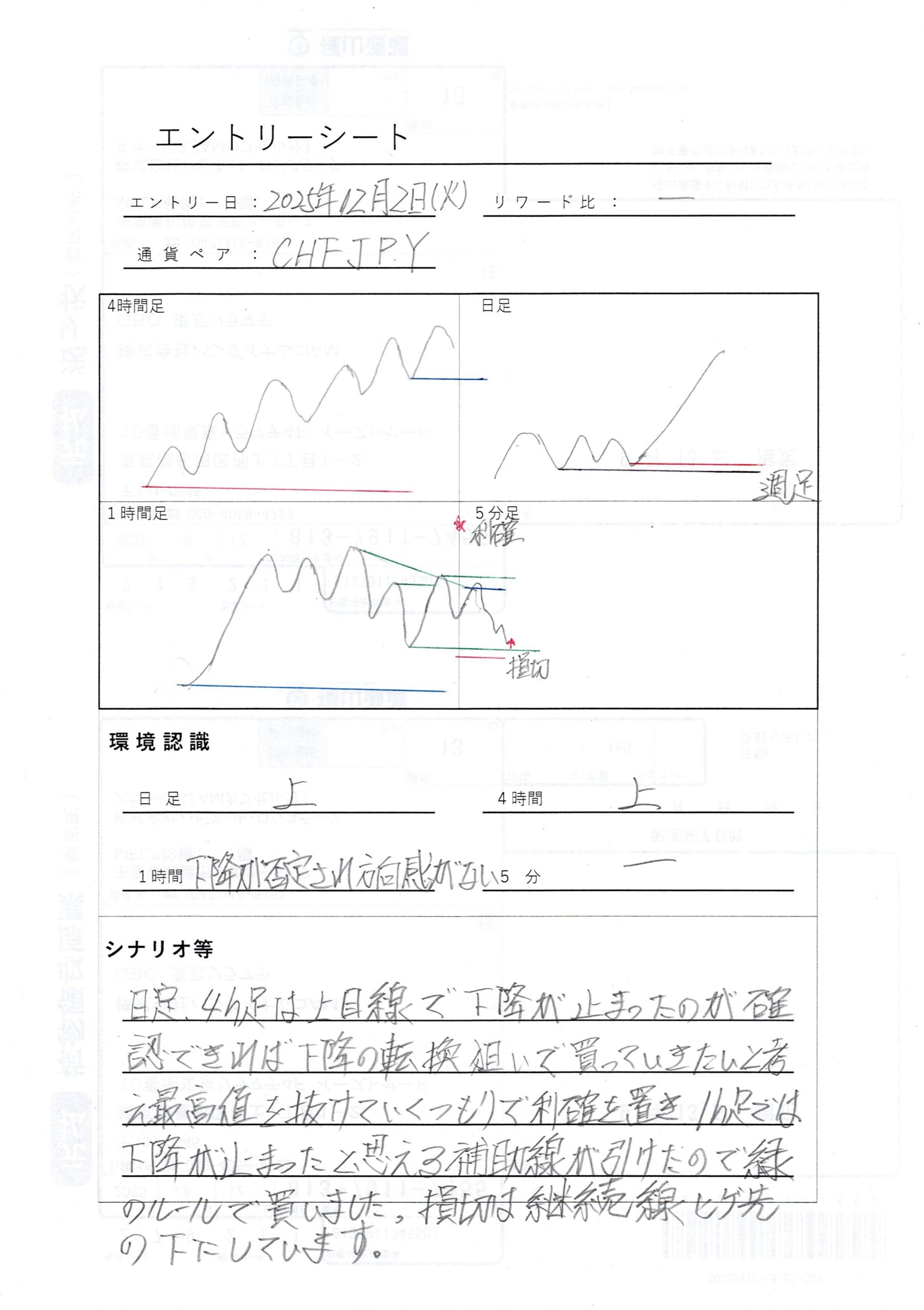 12月2日(火)CHFJPYになりますが買いでエントリーをしましたので、 エントリーシートを作成しました。